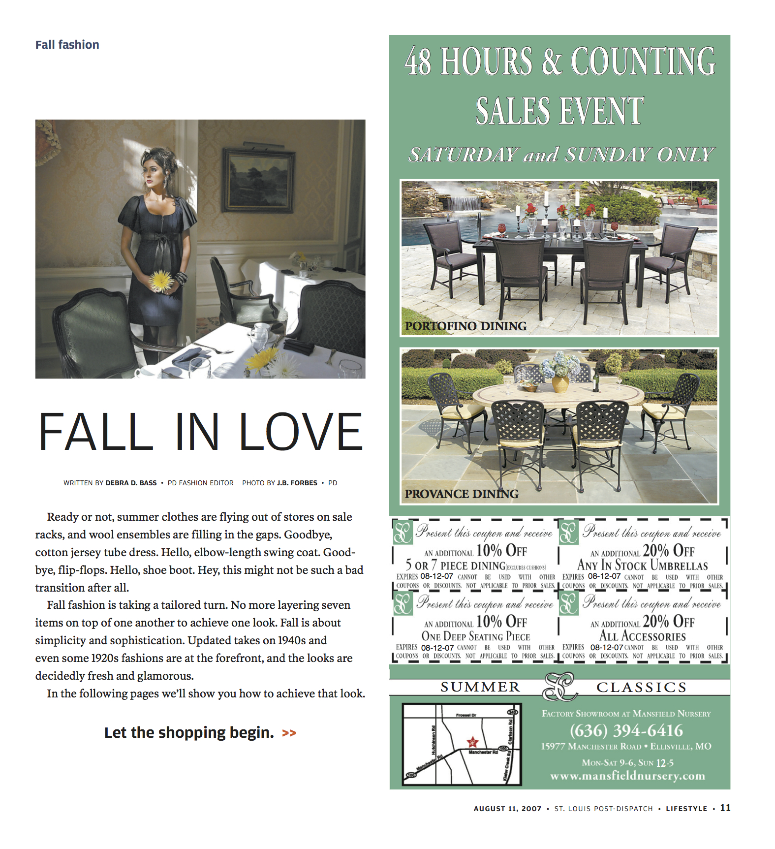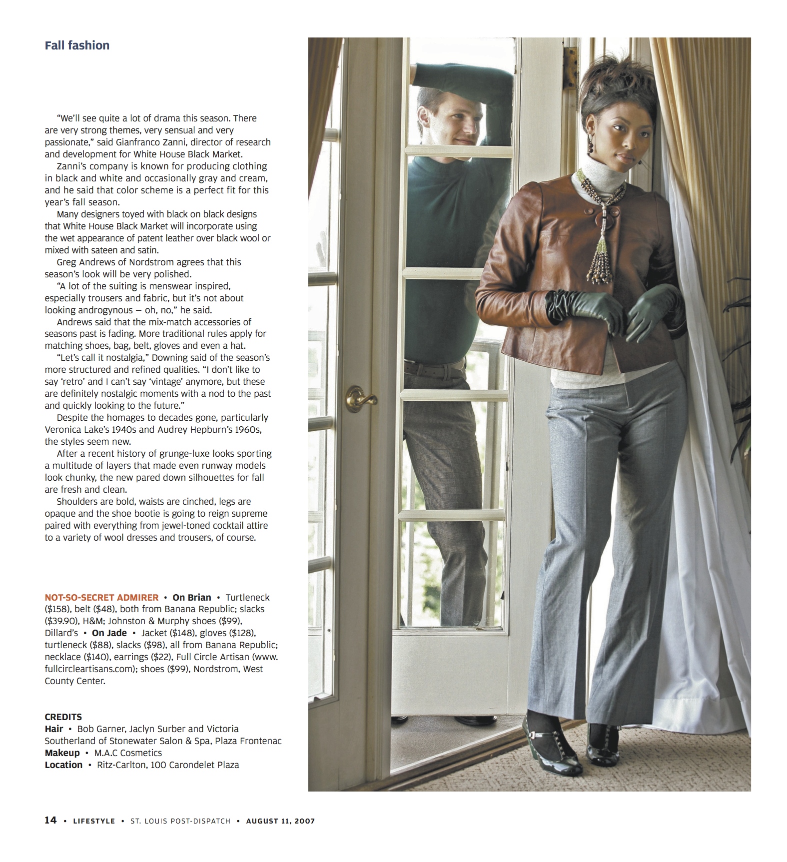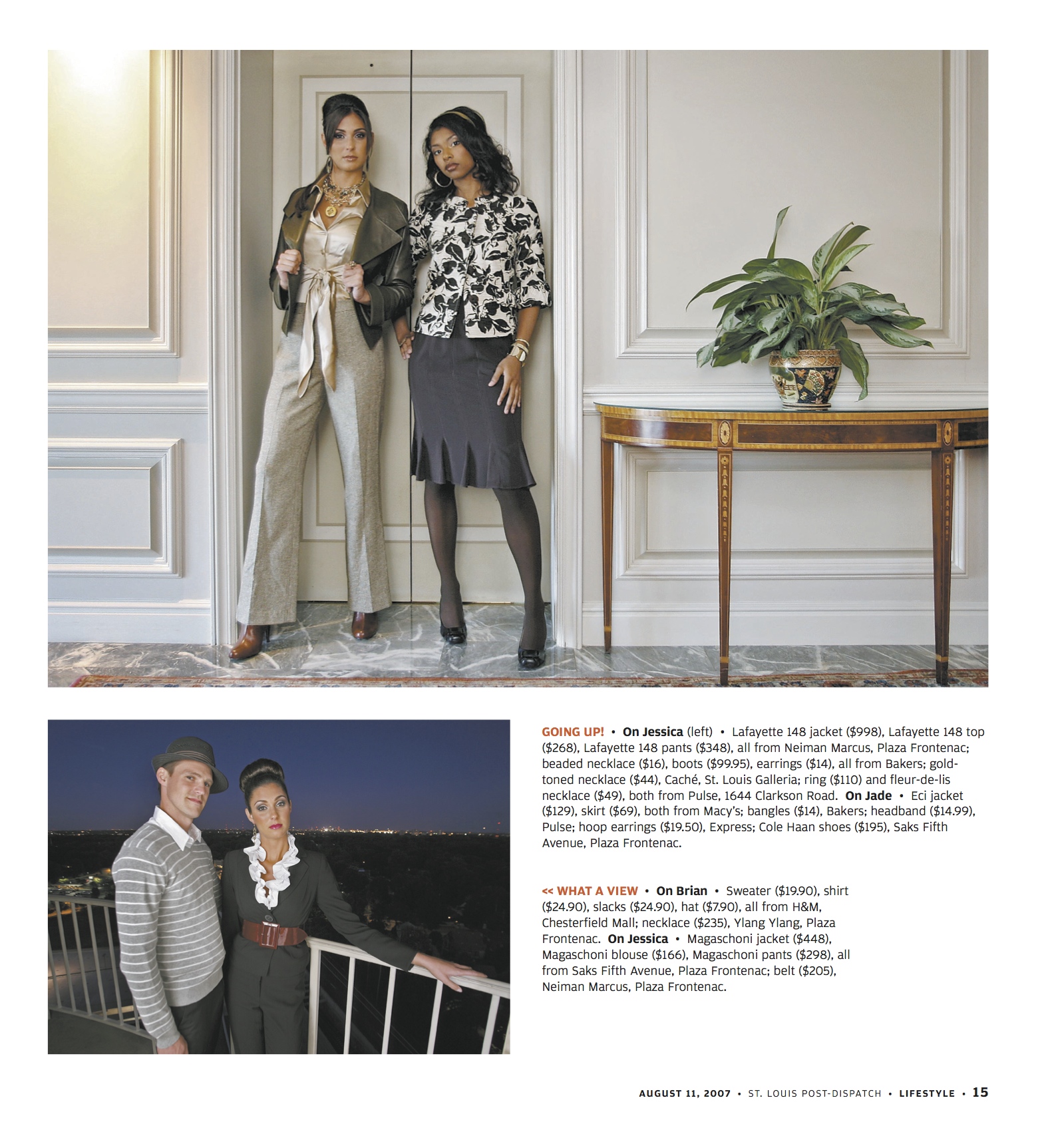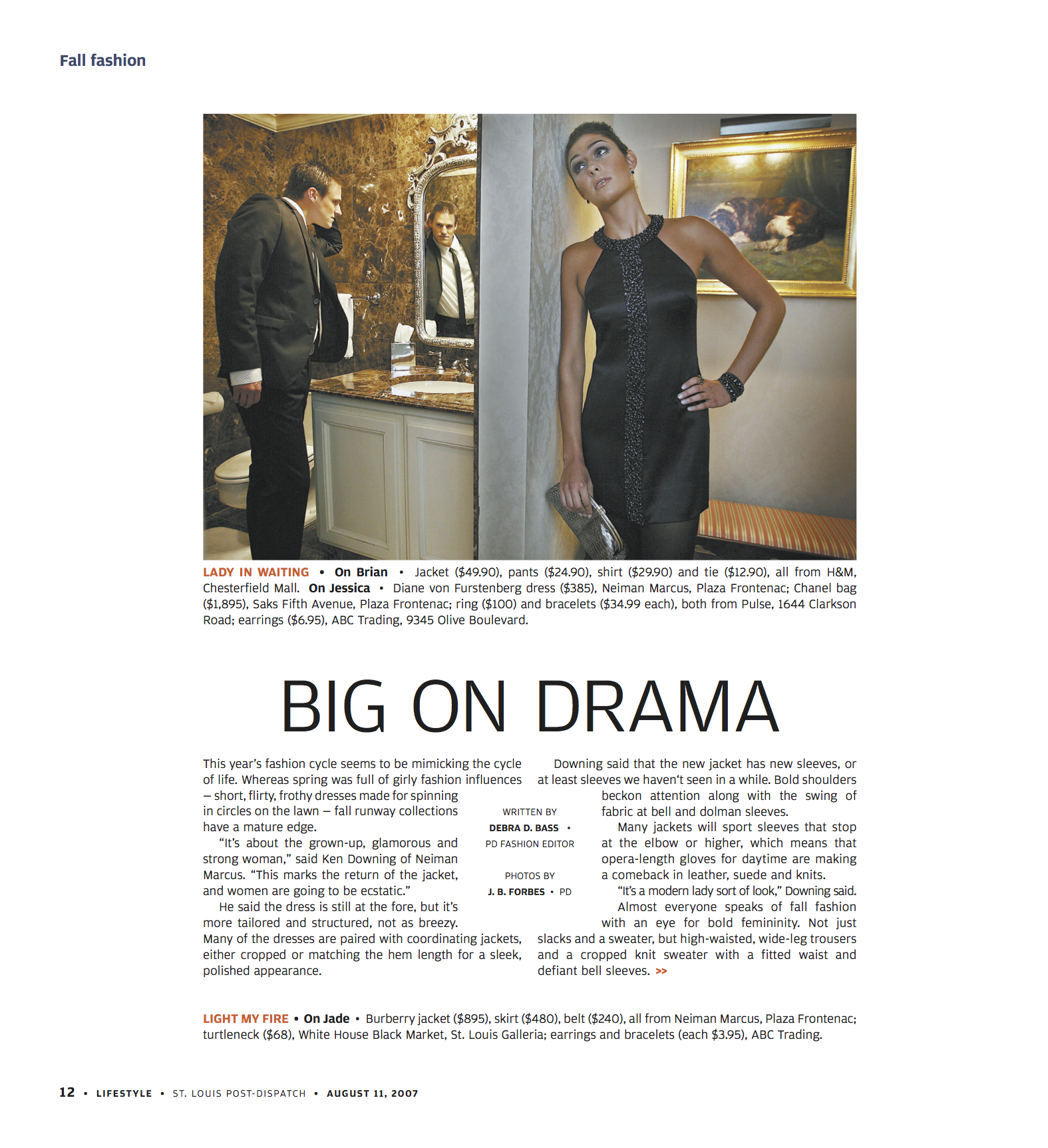 We joked that the last shot should be called “Stalker,” but I put the caption “Not-so-secret admirer” on it instead. It sounded less creepy. We shot this at the local Ritz-Carlton in the presidential suite. It was a lovely day. It stands out because our photographer was J.B. Forbes, a great award-winning hard news photographer who is among the first they sent to war zones and serious breaking news locations. I have never seen him more nervous than when he was working with the models. It was cute.