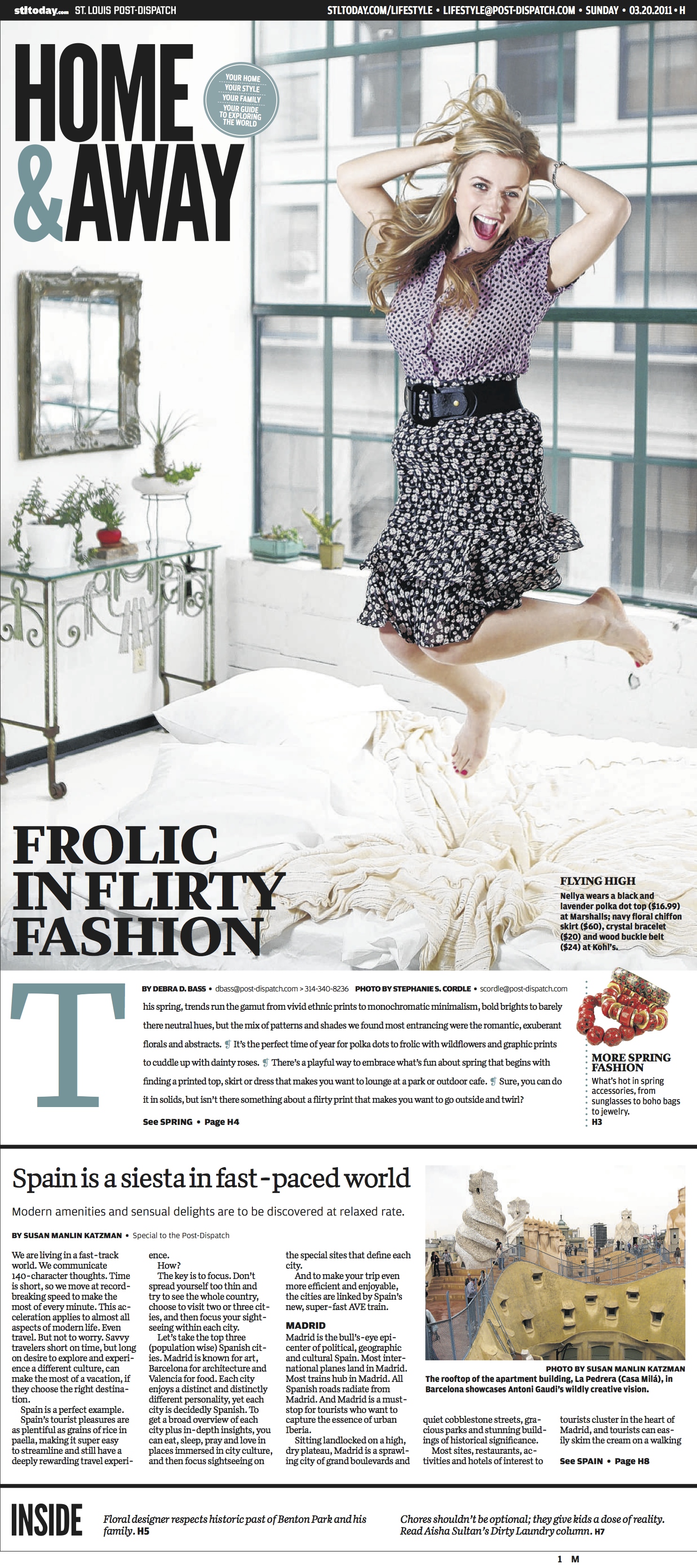 I enjoy spring fashion because it tends to be exuberant. I get to dress girls in splashy colors or floral on floral concoctions that would seem cuckoo any other time of the year. The daily newspaper is not Vogue, we can not always celebrate fashion for fashion sake. It has to make sense. So each year, I pick a story, a theme, a focus and we try to have a little fun. In these two spreads, my focus is color, especially mixing color, but in the first I latched onto the vibrant oranges and limes. I got this fabulous teal-turquoise nail polish so we sent her to a manicurist. I was in love with the color.