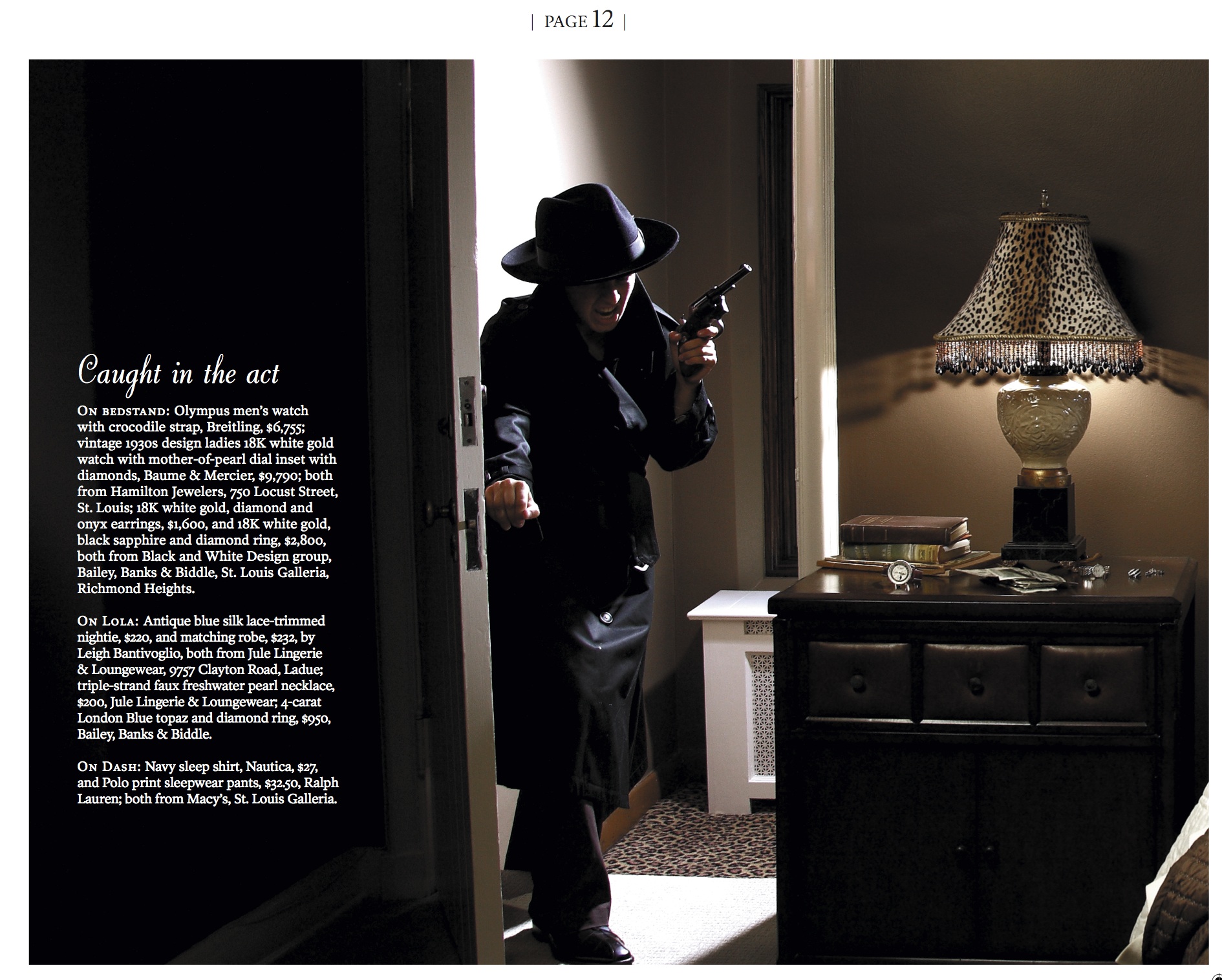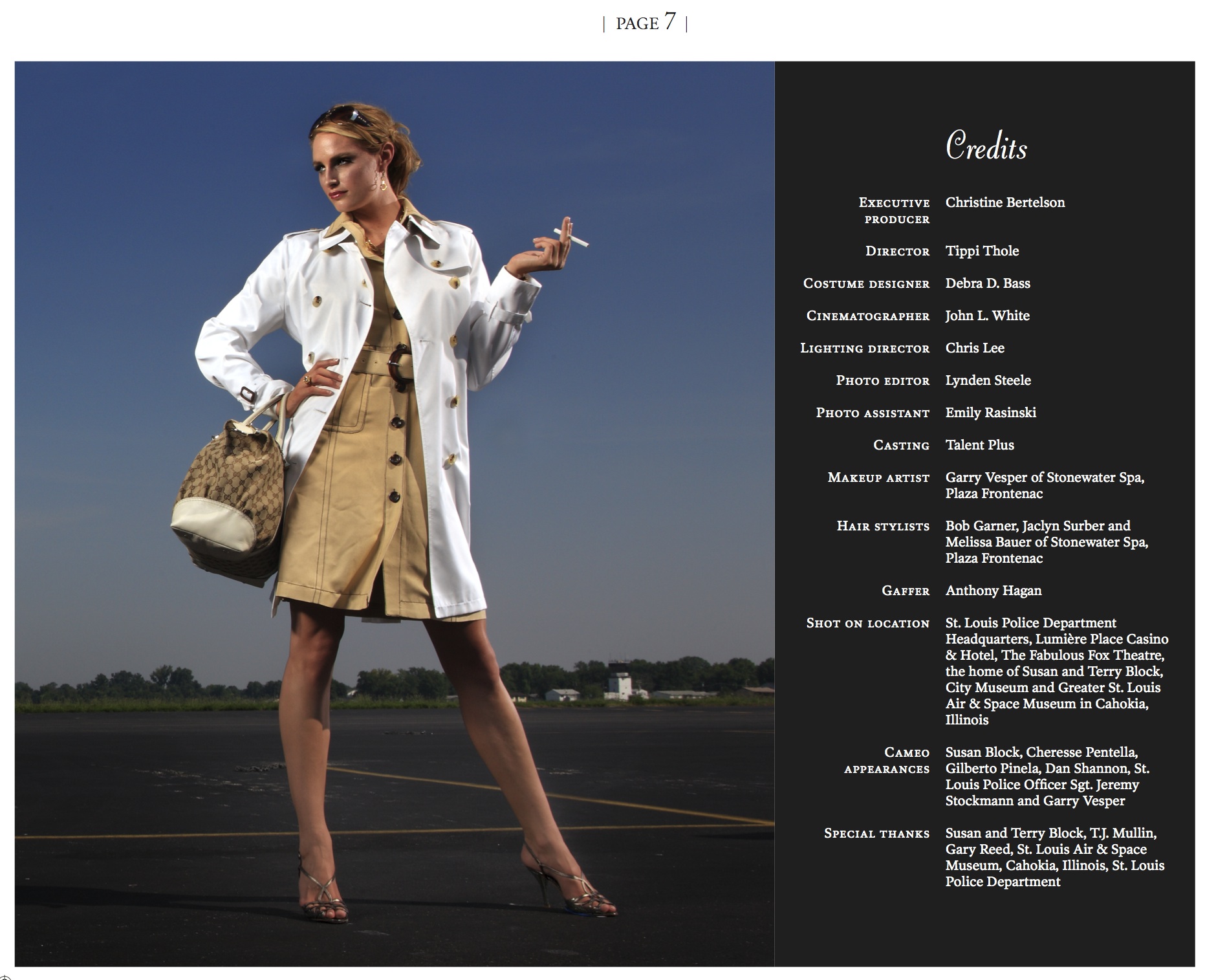 The shadow figure of the detective hunting down our criminal couple is actually Emily, one of our great staff photographers who was Johnny Andrews photo assistant for the shoot. Andrews (the artist formerly known as John L. White) was the genius behind the camera. Full credits are in the photo of Ali at the airport.
