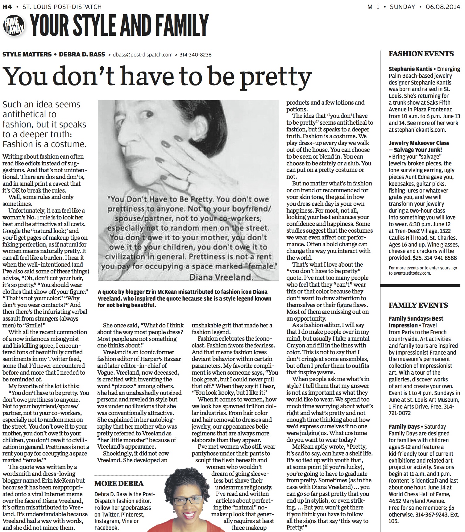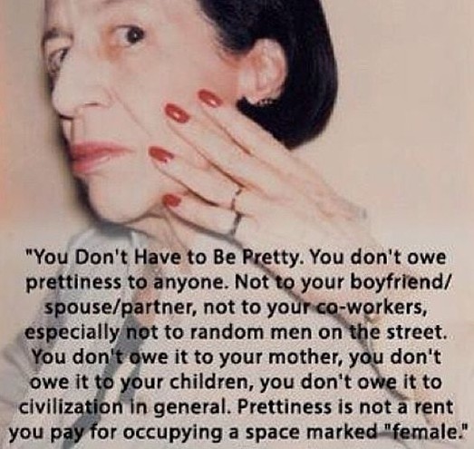 There are many ugly truths about being female in this world. It’s 2014 and there’s still much progress to be made. To be female comes with a list of expectations about femininity that can feel oppressive. The most egregious expectation is that we should always strive to be pretty and if possible, very pretty. I never thought about it so directly until I read this quote on a photo of fashion icon Diana Vreeland:
